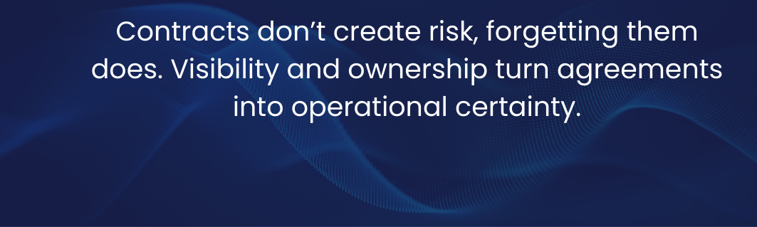 The greatest post-signature risk for SMEs isn’t the contract itself it’s the moments when no one is watching. By centralising contracts, capturing key obligations, automating reminders, and making ownership visible, SMEs close the “risk gap.” This transforms signed agreements from static documents into active, manageable commitments, protecting revenue, ensuring compliance, and reducing disputes all without complex systems.