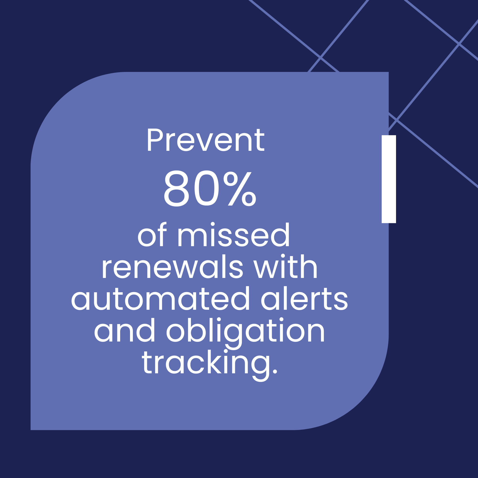 - Prevent 80% of missed renewals through automated alerts and obligation tracking