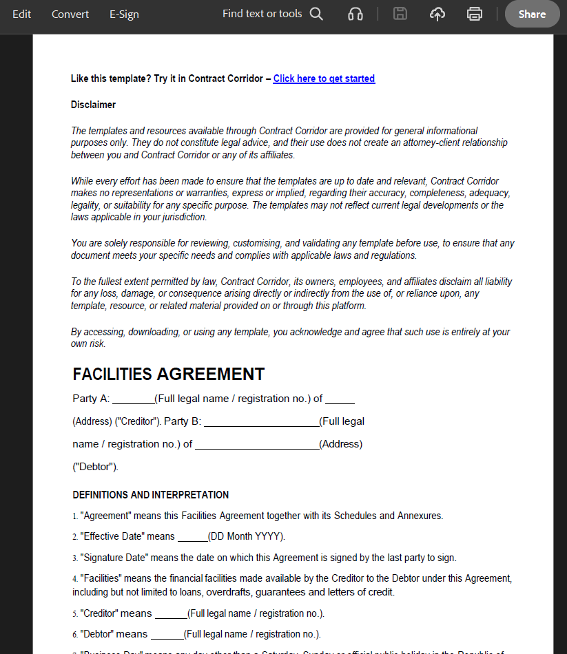 The templates and resources available through Contract Corridor are provided for general informational purposes only. They do not constitute legal advice, and their use does not create an attorney-client relationship between you and Contract Corridor or any of its affiliates.