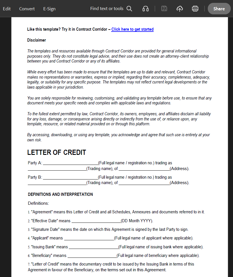 The templates and resources available through Contract Corridor are provided for general informational purposes only. They do not constitute legal advice, and their use does not create an attorney-client relationship between you and Contract Corridor or any of its affiliates.