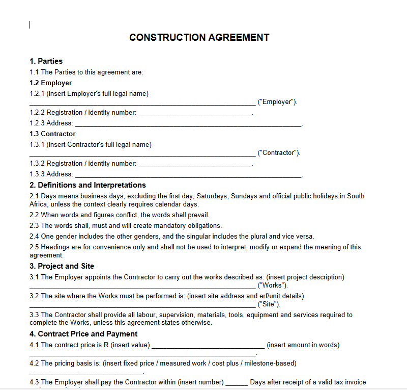 - Copy the text of the sample construction contract template into a word processor.